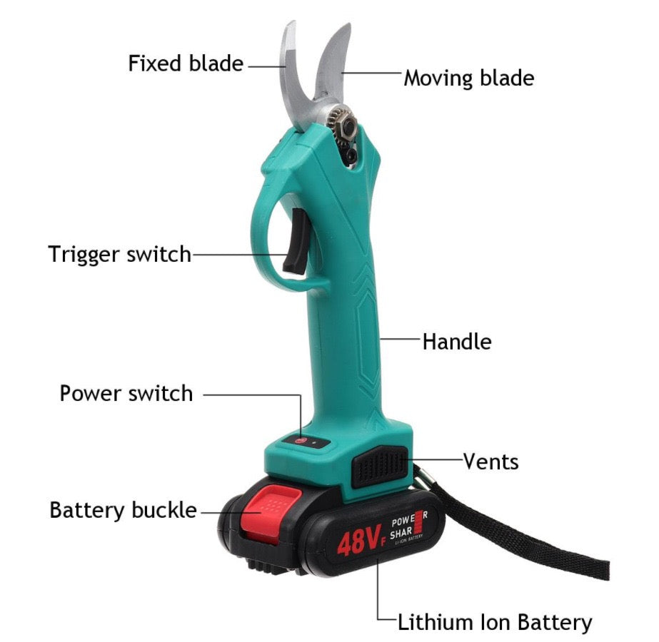 Revolutionize your gardening with these powerful 48V cordless electric pruning shears. Designed for efficiency and comfort, they effortlessly cut through branches, making tree and shrub maintenance a breeze. The ergonomic design reduces hand fatigue, while the two included batteries ensure extended working time. Comes with a durable carrying case for easy transport and storage, making it an essential tool for every gardener.