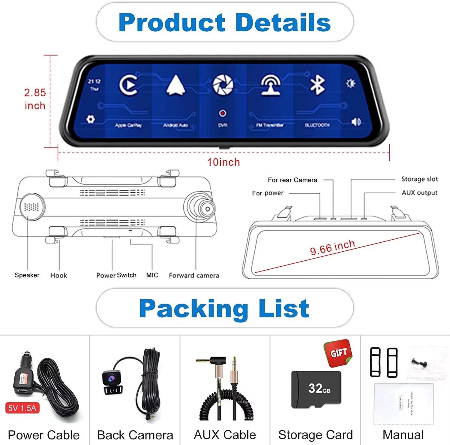Upgrade your driving experience with our 4K Smart Mirror Dash Cam. This universal device seamlessly integrates a high-resolution 4K front camera, a rear-view DVR, and wireless Apple CarPlay/Android Auto into a sleek mirror design. Enjoy crystal-clear recordings, effortless navigation, hands-free communication, and entertainment directly on its vibrant touchscreen display. Enhance safety and connectivity on every journey.