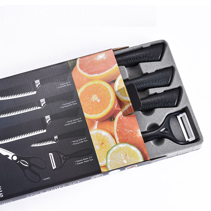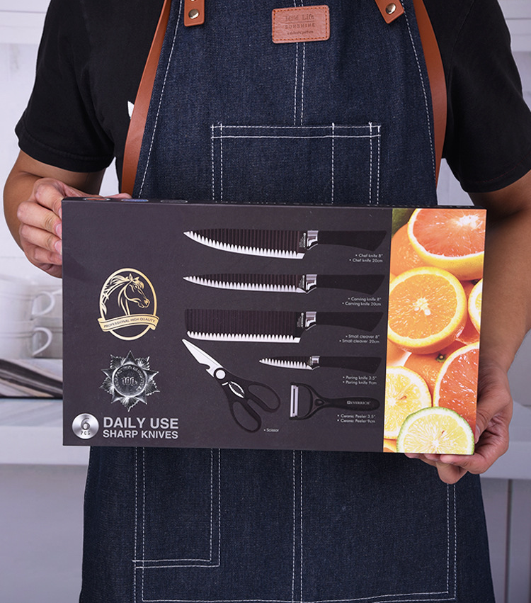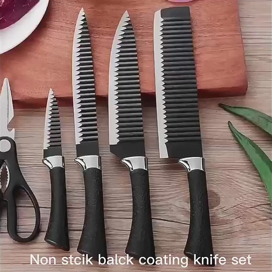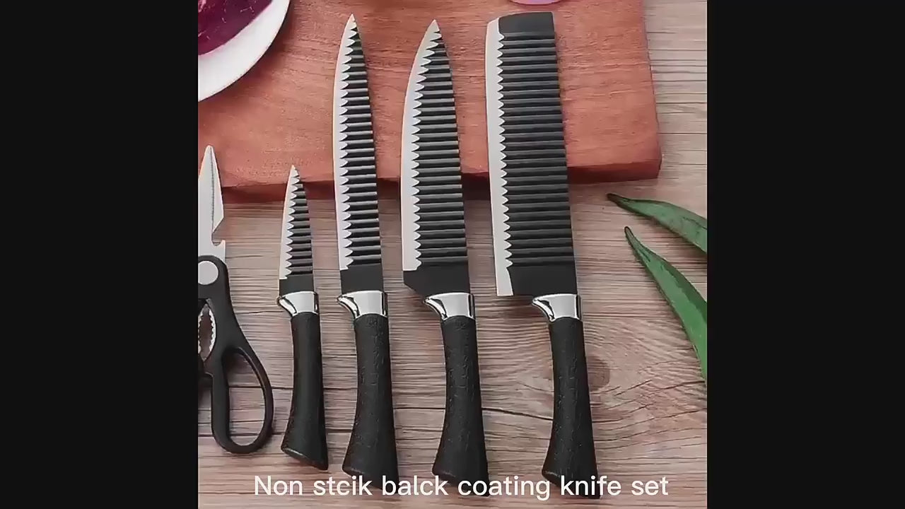 Elevate your culinary experience with this premium 6-piece kitchen knife set. Crafted from high-quality stainless steel, each knife features a unique wave pattern design on the blade, which not only adds a touch of modern elegance but also helps prevent food from sticking. The non-stick coating ensures effortless slicing and dicing, while the ergonomic handles provide a comfortable and secure grip. This versatile set includes all essential tools for any kitchen task, from precision peeling to robust carving, making it a must-have for every home chef.