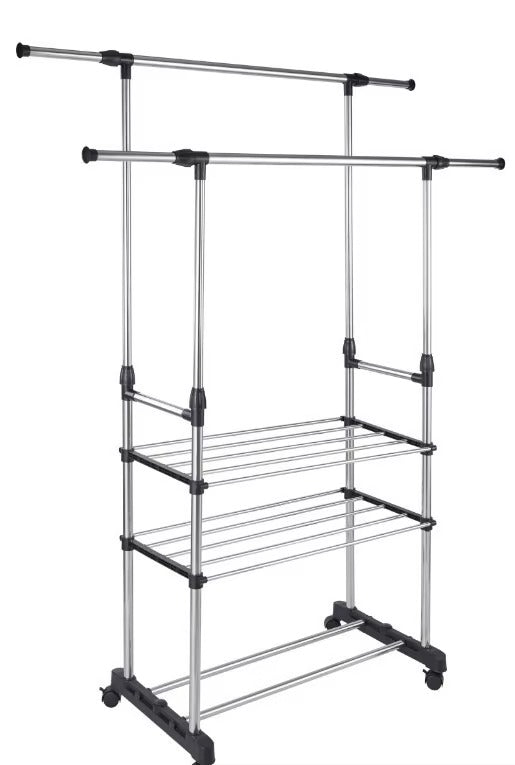 Maximize your storage space with this versatile and sturdy double-rod clothes rack. Featuring adjustable height rods, a convenient bottom shelf for shoes or storage boxes, and smooth-rolling wheels for effortless mobility, this rack is an ideal solution for organizing your wardrobe, laundry room, or any living area. Its robust construction ensures durability, while the sleek design fits seamlessly into any decor.