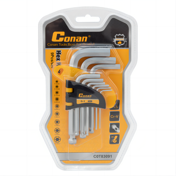 Discover the Conan 9-piece Hex Key Set, an essential addition to any toolbox. Crafted from durable Chromium-Vanadium (Cr-V) steel, these L-shaped wrenches are built for strength and longevity. The convenient ball end on larger sizes allows for angled access, making your work easier in tight spaces. This comprehensive set includes sizes from 1.5mm to 10mm, ensuring you have the right tool for various assembly, repair, and maintenance tasks. Organized in a compact holder, it's perfect for professionals and DIY enthusiasts alike.