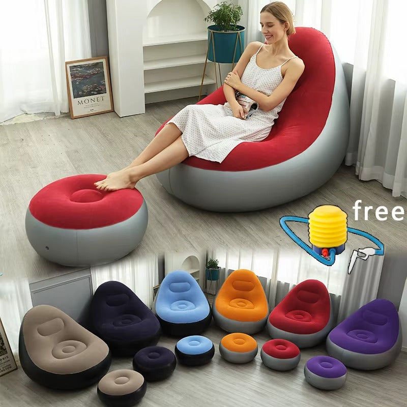 Odkryj nowy wymiar relaksu dzięki naszemu nadmuchiwanemu fotelowi z podnóżkiem. Ten stylowy zestaw w kolorze fioletowo-szarym został zaprojektowany z myślą o maksymalnym komforcie użytkownika. Wykonany z wytrzymałego materiału PVC z miękkim, welurowym wykończeniem, jest przyjemny dla skóry i zapobiega ślizganiu się podczas siedzenia.