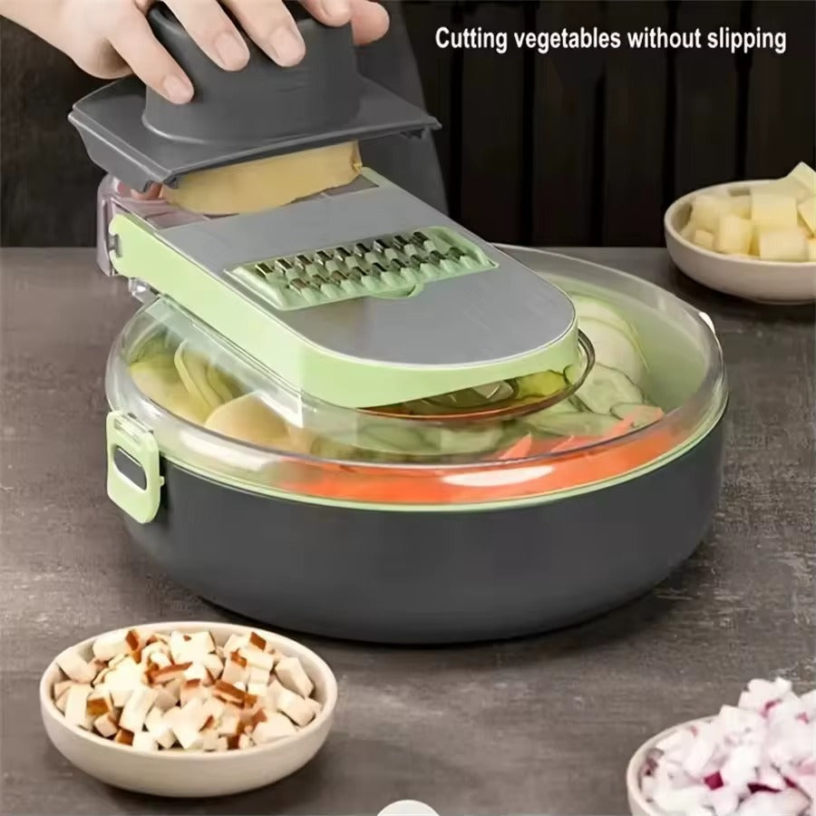 Revolutionize your kitchen prep with our 12-in-1 Multifunction Vegetable Slicer & Grater. This high-quality manual food processor makes slicing, dicing, and grating fruits and vegetables effortless and safe. Featuring multiple interchangeable blades and an integrated collection container, it's designed for efficiency and convenience, ensuring perfectly prepared ingredients every time without the mess.