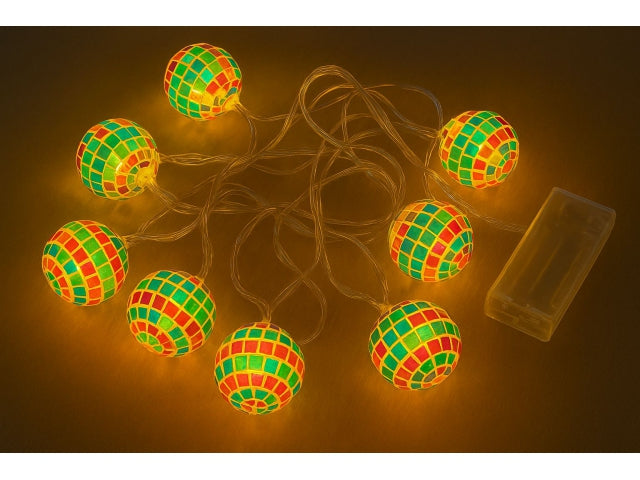 Illuminate your space with these enchanting Mosaic Globe LED String Lights. Featuring beautifully crafted spheres adorned with vibrant mosaic patterns in red, green, and yellow, these lights cast a warm and inviting glow. Perfect for adding a festive touch to any room, patio, or special event, their battery-powered design offers ultimate flexibility for placement without the need for an outlet. Create a cozy atmosphere or a dazzling party setting with ease.