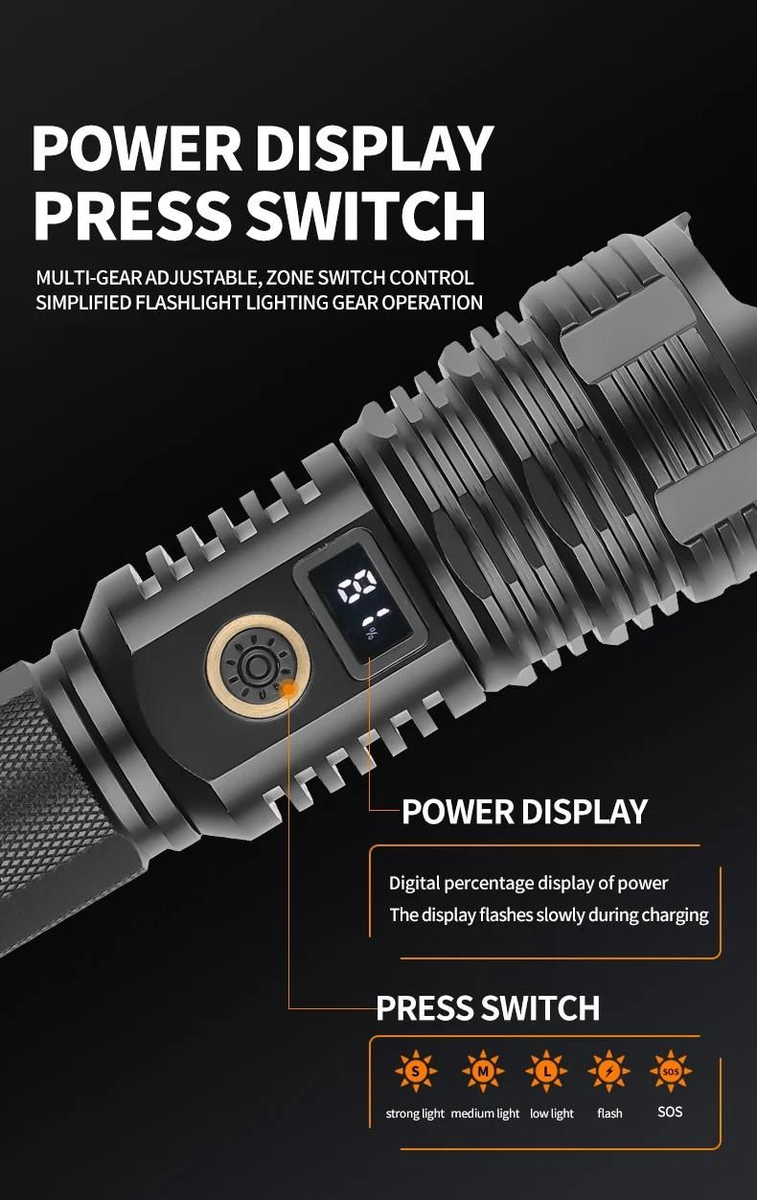 Rozświetl swoją drogę z mocną latarką akumulatorową P90. Wyposażona w zaawansowaną diodę P90, ta taktyczna latarka generuje imponujące 1500 lumenów jasnego światła, zapewniając wyjątkową widoczność w każdej sytuacji. Regulowana funkcja zoomu pozwala bez wysiłku przełączać się między szerokim światłem rozproszonym a skupioną wiązką, dostosowując się do Twoich potrzeb. Stworzona z myślą o trwałości i wygodzie, jest ładowana przez USB, co czyni ją idealną do przygód na świeżym powietrzu, zestawów awaryjnych lub użytku profesjonalnego. Jej kompaktowa konstrukcja, widoczna w porównaniu z iPhone'em X, zapewnia przenośność bez kompromisów w kwestii mocy.