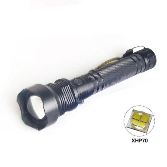 Illuminate your path with the Powerful P90 Rechargeable Flashlight. Featuring an advanced P90 LED, this tactical torch delivers an impressive 1500 lumens of bright light, ensuring exceptional visibility in any situation. The adjustable zoom function allows you to switch effortlessly between a wide floodlight and a focused spotlight, adapting to your specific needs. Built for durability and convenience, it's USB rechargeable, making it ideal for outdoor adventures, emergency kits, or professional use. Its compact design, demonstrated by its size relative to an iPhone X, ensures portability without compromising on power.
