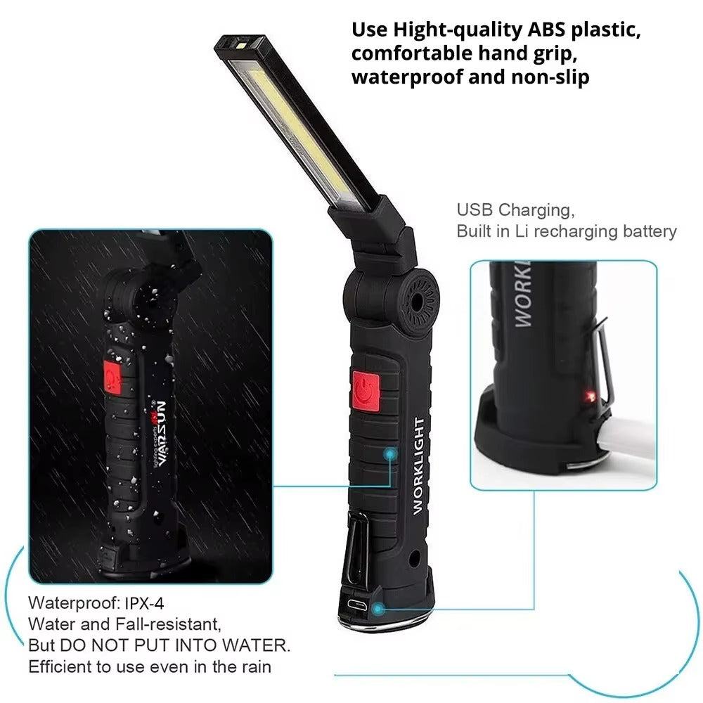 Illuminate any task with our versatile Rechargeable LED Work Light. Featuring a powerful COB LED, it offers 5 distinct lighting modes to suit various needs. Its robust IP64 waterproof design, integrated magnet, and convenient hook make it perfect for workshops, camping, automotive repairs, or any night work. USB-C rechargeable for ultimate convenience and portability.