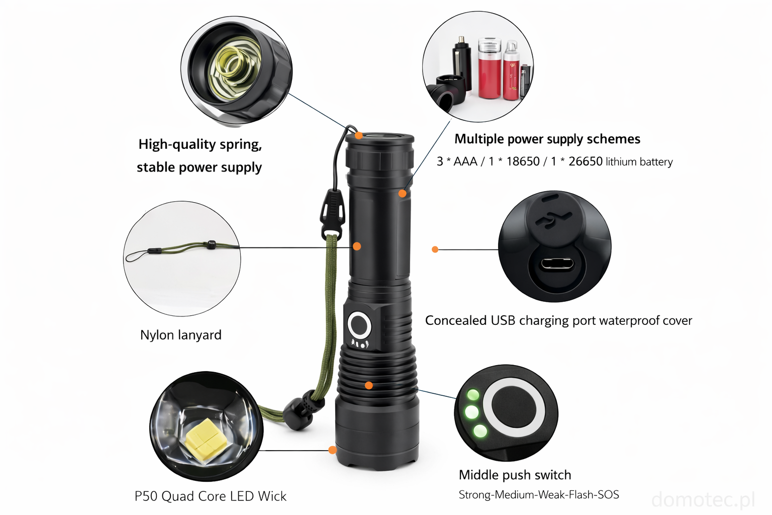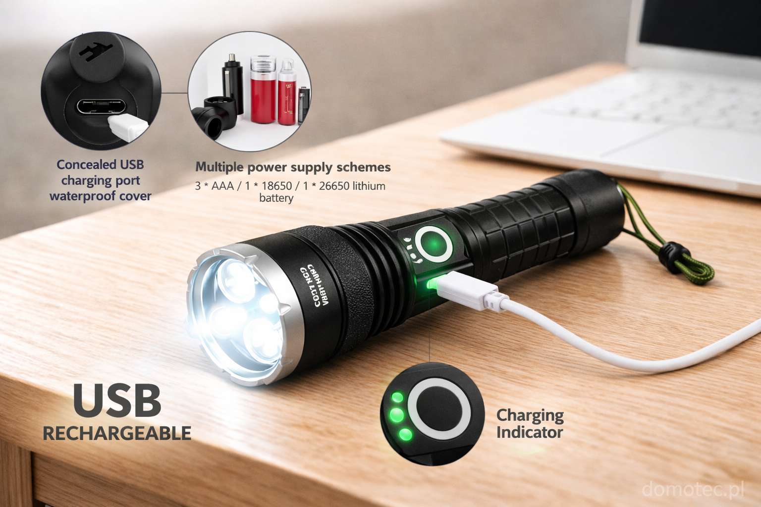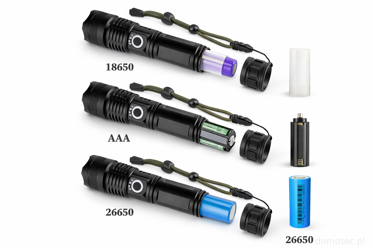 Oświetl swoją drogę naszą wszechstronną taktyczną latarką LED, zaprojektowaną z myślą o niezawodności i adaptacji. Ta wytrzymała latarka oferuje niezrównaną elastyczność, obsługując baterie 18650, AAA (z dołączonym adapterem) oraz 26650, dzięki czemu nigdy nie zostaniesz w ciemności. Wykonana z trwałego stopu aluminium, jest zbudowana, aby wytrzymać najtrudniejsze warunki, co czyni ją niezbędnym narzędziem do przygód na świeżym powietrzu, gotowości na sytuacje awaryjne lub codziennego użytku. Jej potężna dioda LED zapewnia jasne, spójne światło, a dołączony pasek na nadgarstek zapewnia bezpieczne trzymanie. Wybierz latarkę, która dostosowuje się do Twoich potrzeb.